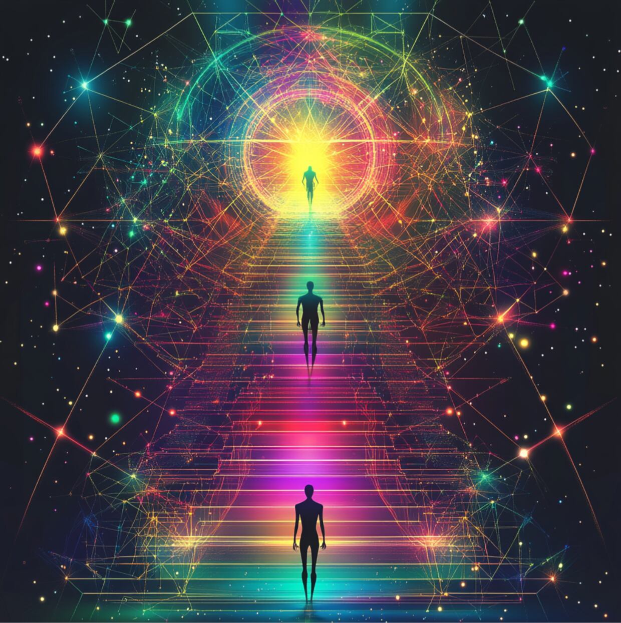 無限に広がる幾何学模様と星々の中、上昇する人影が神秘的なエネルギーを感じさせます。